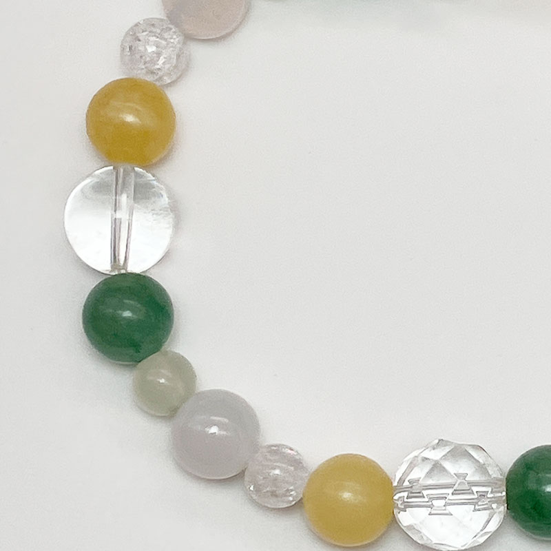 水晶32面カット 10mm×2 アベンチュリン 8mm×4 ネフライト 6mm×4 ホワイトメノウ 8mm×4 アラゴナイト 8mm×4 クラック水晶 6mm×4 |