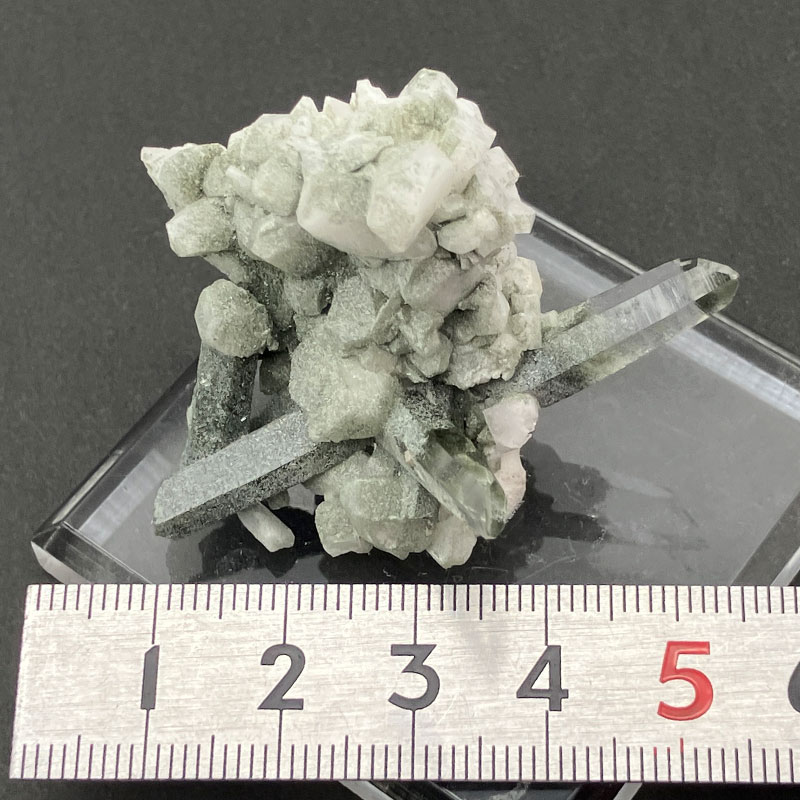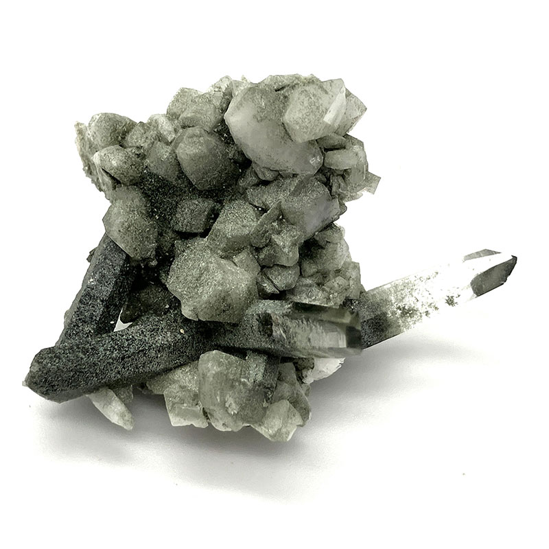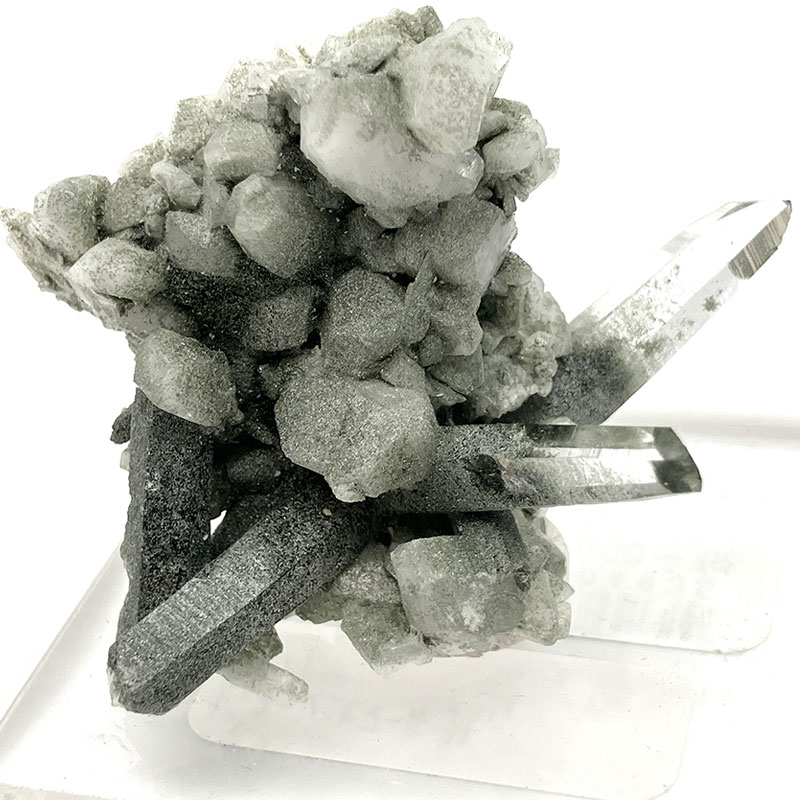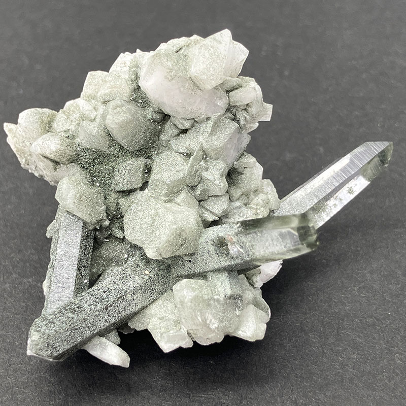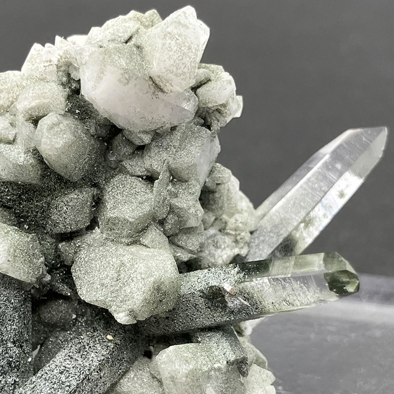 トゲのように鋭くシャープな結晶が群生し、クローライトが付着してるため