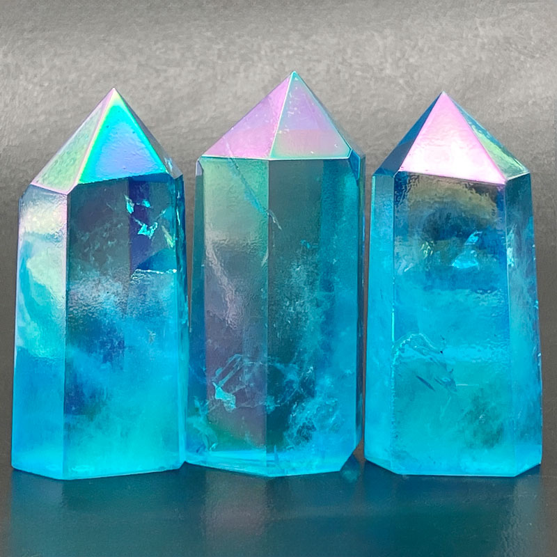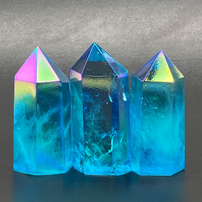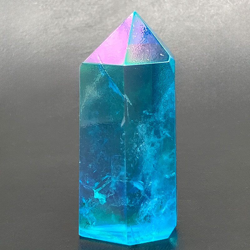 水晶の表面に1600°Cの高熱でイオン化したチタンや金属を真空蒸着させたもの。